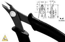 Static Safe Pliers and CuttersSpecialty Electronics ToolsMade from high carbon steel. Accurately machined, these high quality precision tools are designed for fine assembly operations on electronic circuits. Following styles are available with side cutter, flat, round and bent nose, allowing bending setting shaping operations, even in confined areas. Accurate heat treatment provides the necessary performance and durability. |